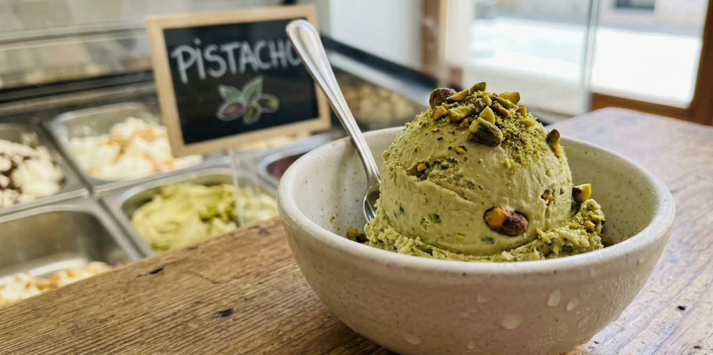 Pistachos sicilianos tostados a fuego lento, base de crema de leche orgánica de los Alpes y un toque sutil de escamas de sal marina de Maldon para realzar el dulzor natural.